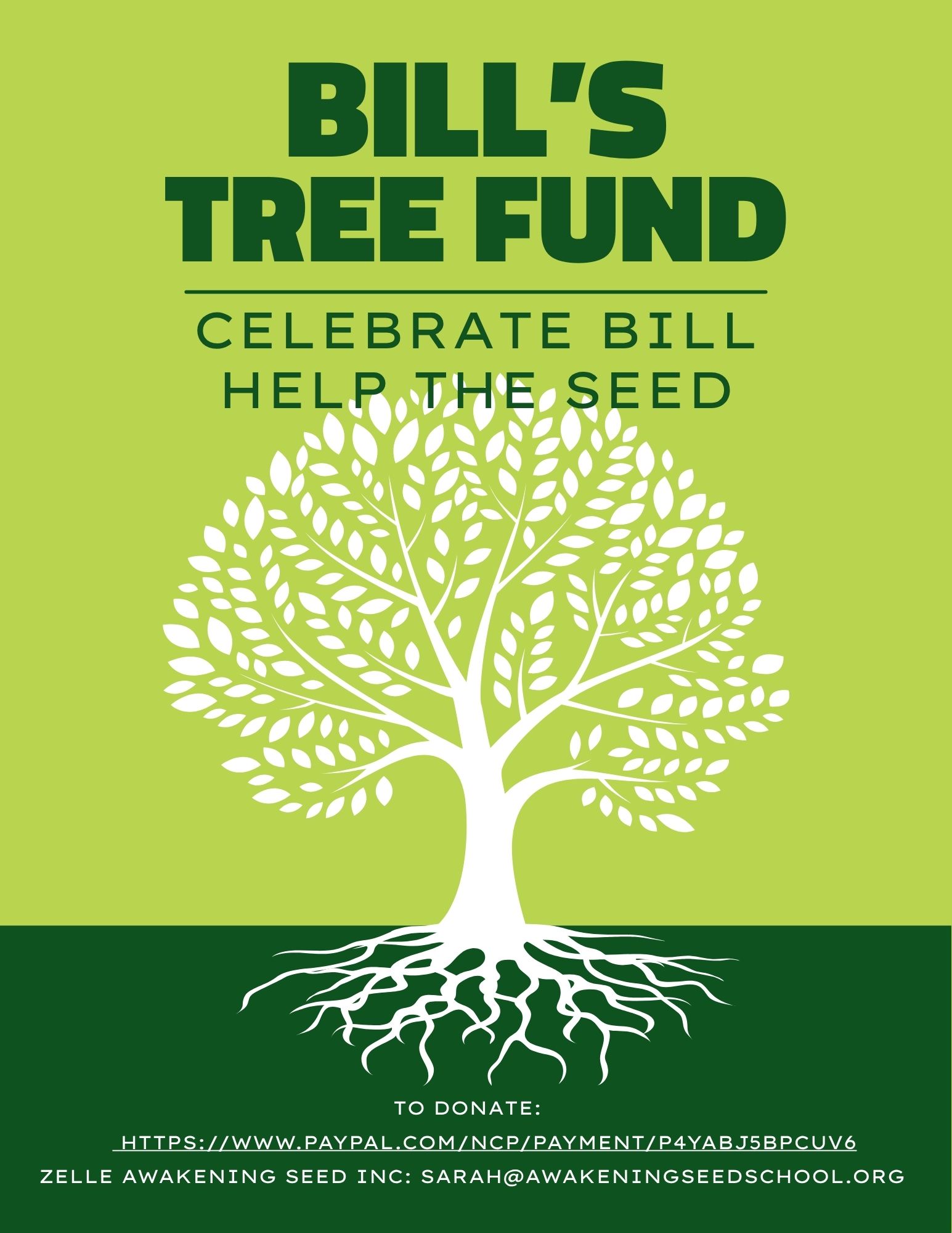 In honor of his 80th birthday and his retirement, we’re holding a celebration at the Seed for Bill on Friday, November 7, from 3:30-5:30pm. Please plan to join us if you can, and/or send him a card. We’re asking people to bring a story to tell about Bill, since he prides himself as a storyteller. If you can’t make it and want to participate in celebrating Bill, you may send an email to me at mary@awakeningseedschool.org. We’ve also set up a tree fund in Bill’s honor, since he has been our keeper of the trees over the years. His spirit will linger in those trees, spreading light and love to future generations of Seeds. Thanks, Bill.