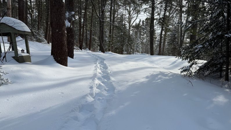 My recent visit was different from the rest in that it occurred during winter. Our normal activities were not possible because they required warm days and being near a large body of water that was not frozen. The seasonal difference invited cozy conversations by the wood stove and hearty warm meals. A common activity of both summer and winter was walking along forested paths and roads with one significant difference, the presence of snow.