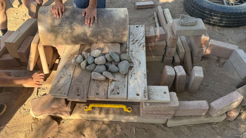 I’ve thought about this for several days, and also reflected on our building area of the playground. I was out there this morning and was astounded with the variety of engagement I saw from children of all ages. For a starter, an adorable group of three-year-olds was sitting on a circle of bricks. One child said, “We’re making an office.” Pointing to her friends, she added, “They are veterinarians.” Nearby another group of elementary students was working on a structure of large branches propped up against a tree. The same girls have been working on their “tent” for several weeks, continually revising the structure and its materials. One element of their play is that they’ve been inclusive of younger children helping out, incorporating their ideas as much as possible.